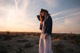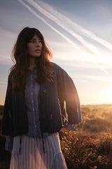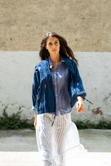 Kimono style jacket, little pleats in the front, it does not overlap and closes with a string in the front. Indigo base color with cactus and sun prints. 100% khadi cotton.