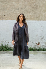V neck dress, below knee length, three quarter sleeves, buttons all the way down, one flounce in the bottom. W.Black fabric with little embroidered stripes tone on tone. 100% light khadi cotton.
