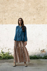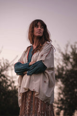 Ocean color fabric with light grey embroideries. Oversized fit. 100% light khadi cotton.