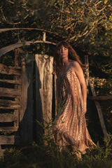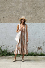 Straps printed dress with one flounce in the bottom. The straps have two buttons to regulate length. 100% khadi cotton dress.