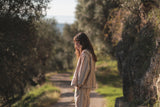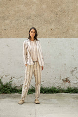 Five pockets pant, low crotch and wide leg. Striped fabric, powder color base, powder and washed black stripes. 100% khadi cotton.